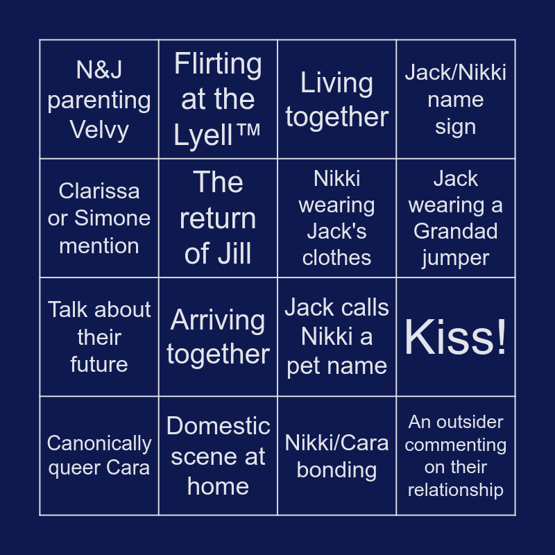 This bingo card has 16 words: Domestic scene at home, Kiss!, Living together, N&J parenting Velvy, Talk about their future, Flirting at the Lyell™, Jack calls Nikki a pet name, Nikki/Cara bonding, Clarissa or Simone mention, The return of Jill, Canonically queer Cara, Jack/Nikki name sign, Arriving together, Jack wearing a Grandad jumper, Nikki wearing Jack's clothes and An outsider commenting on their relationship.