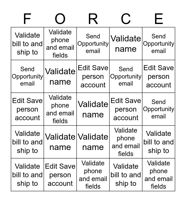 This bingo card has a free space and 24 words: Validate name, Edit Save person account, Edit Save person account, Validate bill to and ship to, Send Opportunity email, Validate bill to and ship to, Send Opportunity email, Validate phone and email fields, Edit Save person account, Validate name, Send Opportunity email, Edit Save person account, Validate phone and email fields, Validate bill to and ship to, Validate name, Validate bill to and ship to, Send Opportunity email, Send Opportunity email, Edit Save person account, Validate phone and email fields, Validate phone and email fields, Validate bill to and ship to, Validate name and Validate phone and email fields.