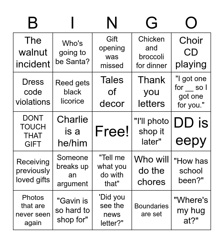 This bingo card has a free space and 24 words: Someone breaks up an argument, "Gavin is so hard to shop for", Tales of decor, Photos that are never seen again, Choir CD playing, The walnut incident, Dress code violations, Who's going to be Santa?, "I'll photo shop it later", "Tell me what you do with that", Thank you letters, DONT TOUCH THAT GIFT, Who will do the chores, "How has school been?", Reed gets black licorice, Boundaries are set, DD is eepy, Gift opening was missed, "I got one for __ so I got one for you.", Charlie is a he/him, "Where's my hug at?", Receiving previously loved gifts, Chicken and broccoli for dinner and 'Did you see the news letter?".