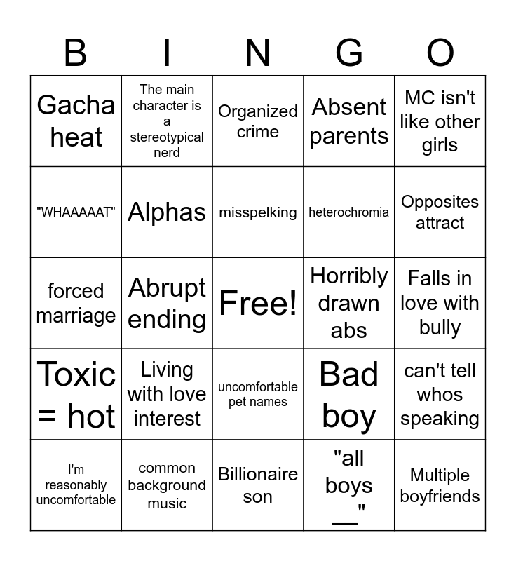This bingo card has a free space and 36 words: Unexplained furry (/demon), Overprotective male, Stockholm Syndrome, Alphas, Bad boy, Toxic = hot, misspelking, face scar, MC isn't like other girls, Mafia, Abrupt ending, Absent parents, Absurd fashion choices, Horribly drawn abs, Opposites attract, Gacha heat, Age warning, Living with love interest, Multiple boyfriends, Organized crime, Falls in love with bully, can't tell whos speaking, common background music, I'm reasonably uncomfortable, Billionaire son, The main character is a stereotypical nerd, forced marriage, antagonist / baddie dresses in all black, heterochromia, "WHAAAAAT", love triangle, close to sex scene, "all boys __", uncomfortable pet names, Hybrid and Silly.