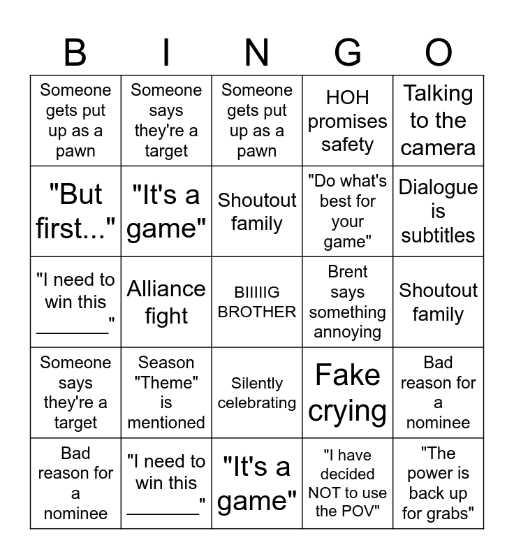 This bingo card has a free space and 54 words: Sound cuts out, Someone says they're a target, Attempted Backdoor, "I ______ Vote to Evict", Silently celebrating, "I have decided NOT to use the POV", HOH promises safety, "Who wants to see my HOH room?", "But first...", Unanimous Vote, Someone gets put up as a pawn, Someone throws the comp, "I need to win this _______", Bad reason for a nominee, Jury House Mentioned, "It's a game", "The power is back up for grabs", "Do what's best for your game", Someone re-explains rules in the diary room, Shoutout family, Fake crying, Wildcard by fate, Brent says something annoying, Talking to the camera, Sound cuts out, Someone says they're a target, Attempted Backdoor, "I ______ Vote to Evict", Silently celebrating, "I have decided NOT to use the POV", HOH promises safety, Violently Sobbing, "But first...", Unanimous Vote, Someone gets put up as a pawn, Someone throws the comp, "I need to win this _______", Bad reason for a nominee, Jury House Mentioned, "It's a game", "The power is back up for grabs", "Do what's best for your game", Chess Board used to show time-lapse, Someone re-explains rules in the diary room, Season "Theme" is mentioned, NYOOOM stinger, Talking to the camera, B-Roll when talking about someone, Shoutout family, Alliance fight, Dialogue is subtitles, Showmance content, Faceless voice and America shoutout.