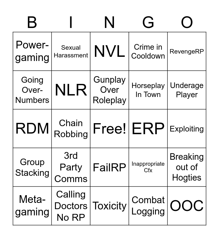 This bingo card has a free space and 24 words: 3rd Party Comms, Calling Doctors No RP, Gunplay Over Roleplay, Meta-gaming, RevengeRP, Power-gaming, Going Over-Numbers, Sexual Harassment, ERP, FailRP, Horseplay In Town, RDM, Inappropriate Cfx, Breaking out of Hogties, NLR, Combat Logging, Exploiting, NVL, Underage Player, Chain Robbing, OOC, Group Stacking, Crime in Cooldown and Toxicity.