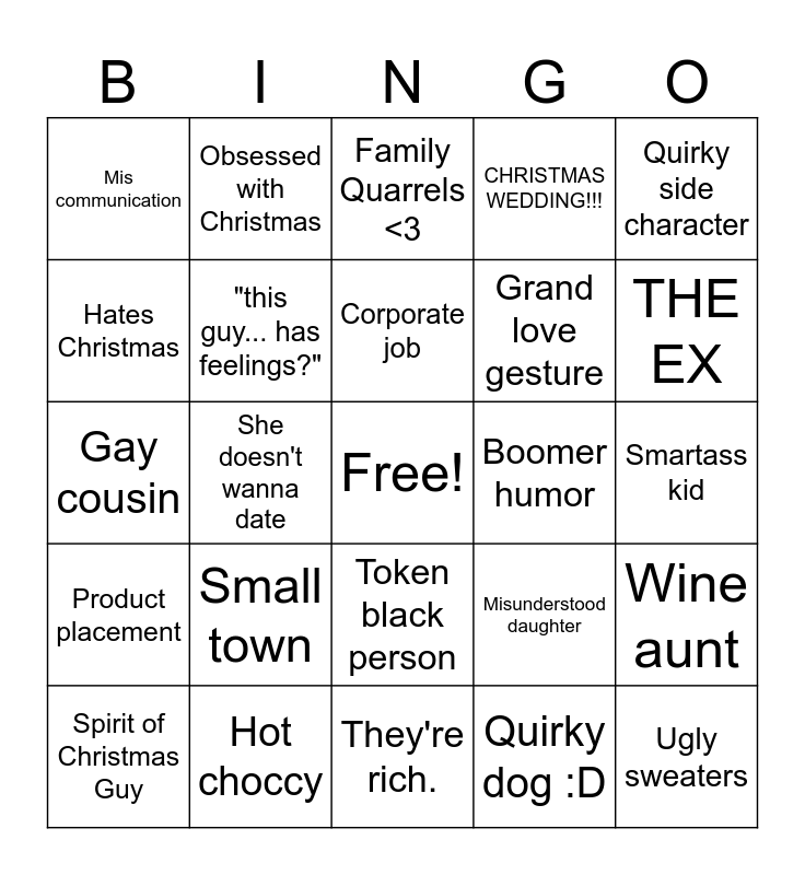This bingo card has a free space and 24 words: Small town, Hot choccy, Corporate job, Spirit of Christmas Guy, Quirky side character, Mis communication, Hates Christmas, Obsessed with Christmas, Boomer humor, Token black person, Grand love gesture, Gay cousin, Misunderstood daughter, Wine aunt, "this guy... has feelings?", Quirky dog :D, Smartass kid, Family Quarrels <3, THE EX, She doesn't wanna date, Ugly sweaters, Product placement, CHRISTMAS WEDDING!!! and They're rich..