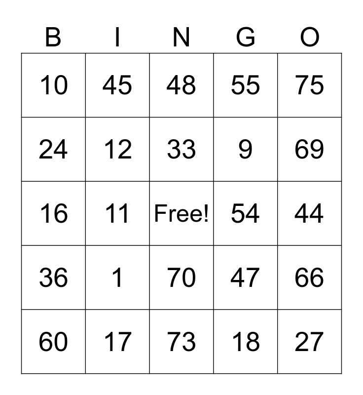 This bingo card has a free space and 24 words: 1, 17, 33, 60, 75, 10, 24, 45, 54, 70, 9, 16, 47, 66, 12, 18, 44, 48, 69, 11, 27, 36, 55 and 73.