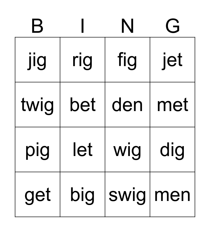 This bingo card has 16 words: big, dig, fig, jig, pig, rig, wig, swig, twig, bet, get, jet, let, met, den and men.