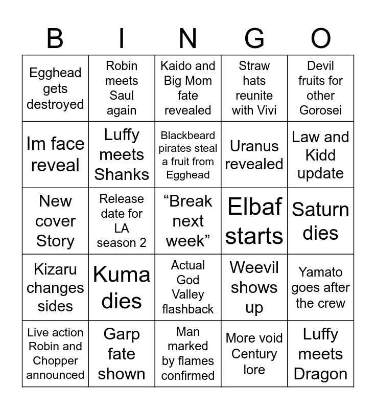 This bingo card has a free space and 24 words: Kuma dies, Garp fate shown, Blackbeard pirates steal a fruit from Egghead, Live action Robin and Chopper announced, Devil fruits for other Gorosei, Egghead gets destroyed, Im face reveal, Robin meets Saul again, Elbaf starts, Actual God Valley flashback, Uranus revealed, New cover Story, Weevil shows up, Yamato goes after the crew, Luffy meets Shanks, More void Century lore, Saturn dies, Kaido and Big Mom fate revealed, Law and Kidd update, Release date for LA season 2, Luffy meets Dragon, Kizaru changes sides, Straw hats reunite with Vivi and Man marked by flames confirmed.