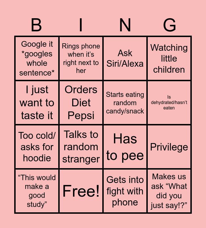 This bingo card has 16 words: Free!, Privilege, Ask Siri/Alexa, Google it *googles whole sentence*, Too cold/ asks for hoodie, Rings phone when it’s right next to her, Has to pee, Gets into fight with phone, I just want to taste it, Orders Diet Pepsi, “This would make a good study”, Watching little children, Talks to random stranger, Is dehydrated/hasn’t eaten, Starts eating random candy/snack and Makes us ask “What did you just say!?”.