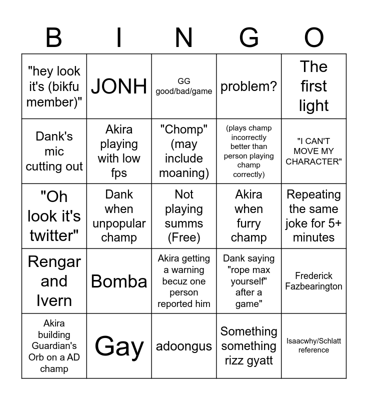 This bingo card has a free space and 24 words: Bomba, Gay, "Chomp" (may include moaning), Akira building Guardian's Orb on a AD champ, The first light, "hey look it's (bikfu member)", Dank's mic cutting out, JONH, Akira when furry champ, Akira getting a warning becuz one person reported him, (plays champ incorrectly better than person playing champ correctly), "Oh look it's twitter", Dank saying "rope max yourself" after a game", Frederick Fazbearington, Akira playing with low fps, Something something rizz gyatt, Repeating the same joke for 5+ minutes, GG good/bad/game, "I CAN'T MOVE MY CHARACTER", Dank when unpopular champ, Isaacwhy/Schlatt reference, Rengar and Ivern, problem? and adoongus.