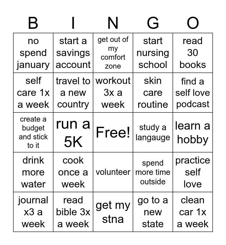 This bingo card has a free space and 24 words: cook once a week, read bible 3x a week, workout 3x a week, journal x3 a week, read 30 books, no spend january, self care 1x a week, start a savings account, study a langauge, volunteer, skin care routine, create a budget and stick to it, spend more time outside, practice self love, travel to a new country, go to a new state, learn a hobby, get out of my comfort zone, find a self love podcast, run a 5K, clean car 1x a week, drink more water, start nursing school and get my stna.