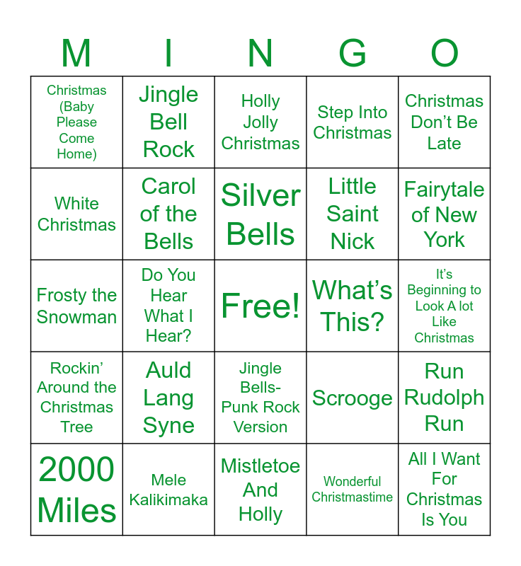 This bingo card has a free space and 25 words: Auld Lang Syne, Mistletoe And Holly, Silver Bells, 2000 Miles, Christmas Don’t Be Late, Christmas (Baby Please Come Home), White Christmas, Jingle Bell Rock, What’s This?, Jingle Bells- Punk Rock Version, Little Saint Nick, Frosty the Snowman, Scrooge, Run Rudolph Run, Carol of the Bells, Christmas for Cowboys, It’s Beginning to Look A lot Like Christmas, Holly Jolly Christmas, Fairytale of New York, Do You Hear What I Hear?, All I Want For Christmas Is You, Mele Kalikimaka, Rockin’ Around the Christmas Tree, Step Into Christmas and Wonderful Christmastime.