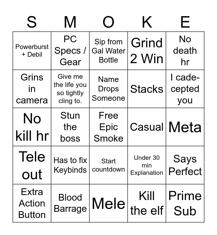 This bingo card has a free space and 29 words: Extra Action Button, 30+ Min Explanation, Stun the boss, Realm Tanking, Powerburst + Debil, Sip from Gal Water Bottle, Give me the life you so tightly cling to., Has to fix Keybinds, Casual, Blood Barrage, Meta, Prime Sub, Mele, Kill the elf, I cade-cepted you, Build on the dummy, Start countdown, Tele out, No death hr, No kill hr, Under 30 min Explanation, Invites Temptation, Stacks, Grins in camera, Grind 2 Win, PC Specs / Gear, Says Perfect, Name Drops Someone and Rizzing.
