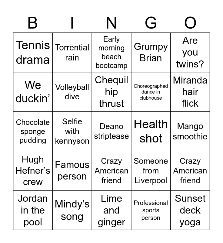 This bingo card has a free space and 24 words: Famous person, Mindy’s song, Chequil hip thrust, Jordan in the pool, Are you twins?, Tennis drama, We duckin’, Torrential rain, Health shot, Crazy American friend, Choreographed dance in clubhouse, Chocolate sponge pudding, Someone from Liverpool, Crazy American friend, Volleyball dive, Professional sports person, Mango smoothie, Early morning beach bootcamp, Miranda hair flick, Selfie with kennyson, Sunset deck yoga, Hugh Hefner’s crew, Grumpy Brian and Lime and ginger.