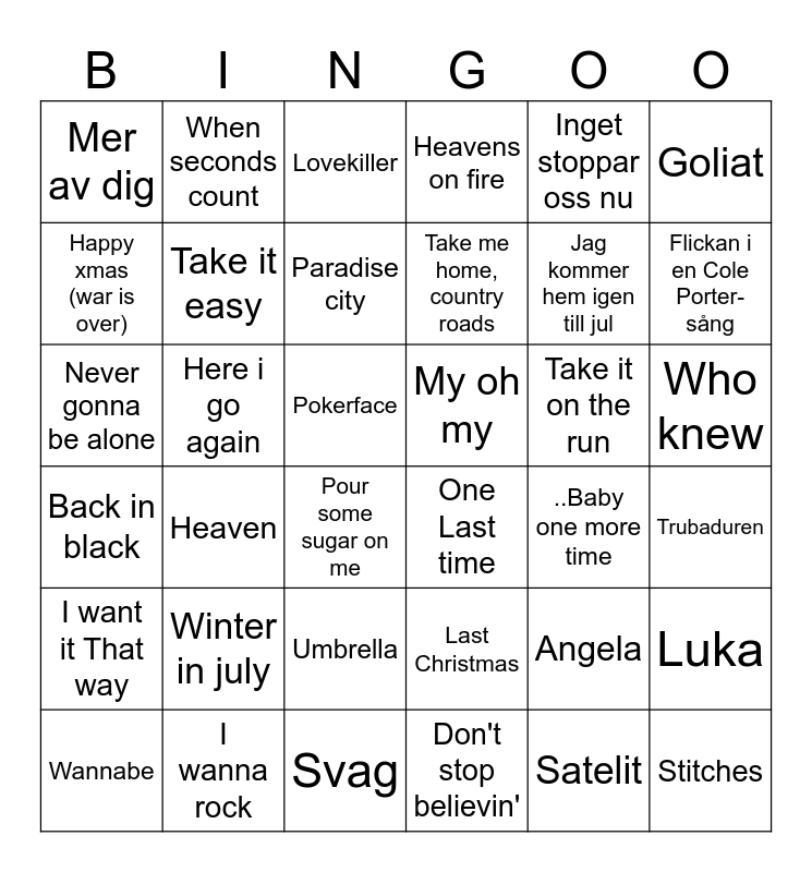 This bingo card has 36 words: Last Christmas, Umbrella, Don't stop believin', Happy xmas (war is over), Back in black, My oh my, Take it easy, Svag, Inget stoppar oss nu, Angela, Flickan i en Cole Porter-sång, Heavens on fire, Luka, Here i go again, Take me home, country roads, Mer av dig, I want it That way, Take it on the run, Never gonna be alone, Lovekiller, Pokerface, Heaven, One Last time, Pour some sugar on me, ..Baby one more time, When seconds count, Jag kommer hem igen till jul, I wanna rock, Paradise city, Goliat, Stitches, Wannabe, Trubaduren, Who knew, Winter in july and Satelit.
