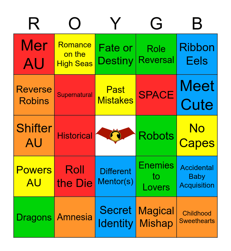 This bingo card has a free space and 24 words: Roll the Die, Amnesia, Past Mistakes, Dragons, Ribbon Eels, Mer AU, Reverse Robins, Romance on the High Seas, Robots, Different Mentor(s), SPACE, Shifter AU, Enemies to Lovers, Accidental Baby Acquisition, Supernatural, Magical Mishap, No Capes, Fate or Destiny, Meet Cute, Historical, Childhood Sweethearts, Powers AU, Role Reversal and Secret Identity.