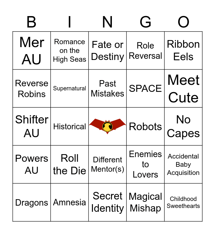 This bingo card has a free space and 24 words: Roll the Die, Amnesia, Past Mistakes, Dragons, Ribbon Eels, Mer AU, Reverse Robins, Romance on the High Seas, Robots, Different Mentor(s), SPACE, Shifter AU, Enemies to Lovers, Accidental Baby Acquisition, Supernatural, Magical Mishap, No Capes, Fate or Destiny, Meet Cute, Historical, Childhood Sweethearts, Powers AU, Role Reversal and Secret Identity.