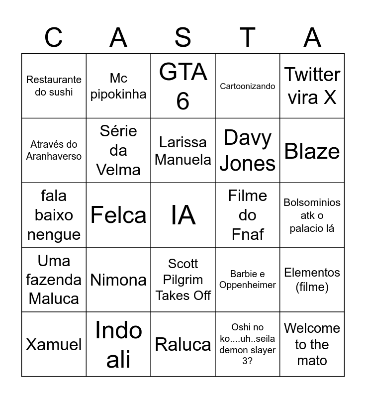 This bingo card has 31 words: Raluca, Sogro e genro, Felca, Vela da Kinnie chan, Restaurante do sushi, GTA 6, Série da Velma, Barbie e Oppenheimer, Filme do Fnaf, Oshi no ko....uh..seila demon slayer 3?, Bolsominios atk o palacio lá, IA, Welcome to the mato, Israel e Hamas, Blaze, RK Play, Elementos (filme), Nimona, Uma fazenda Maluca, Scott Pilgrim Takes Off, Twitter vira X, Core e HBO, Xamuel, Mc pipokinha, Davy Jones, Através do Aranhaverso, Cartoonizando, fala baixo nengue, Indo ali, Larissa Manuela and Animação baseada em Scott Pilgrim.