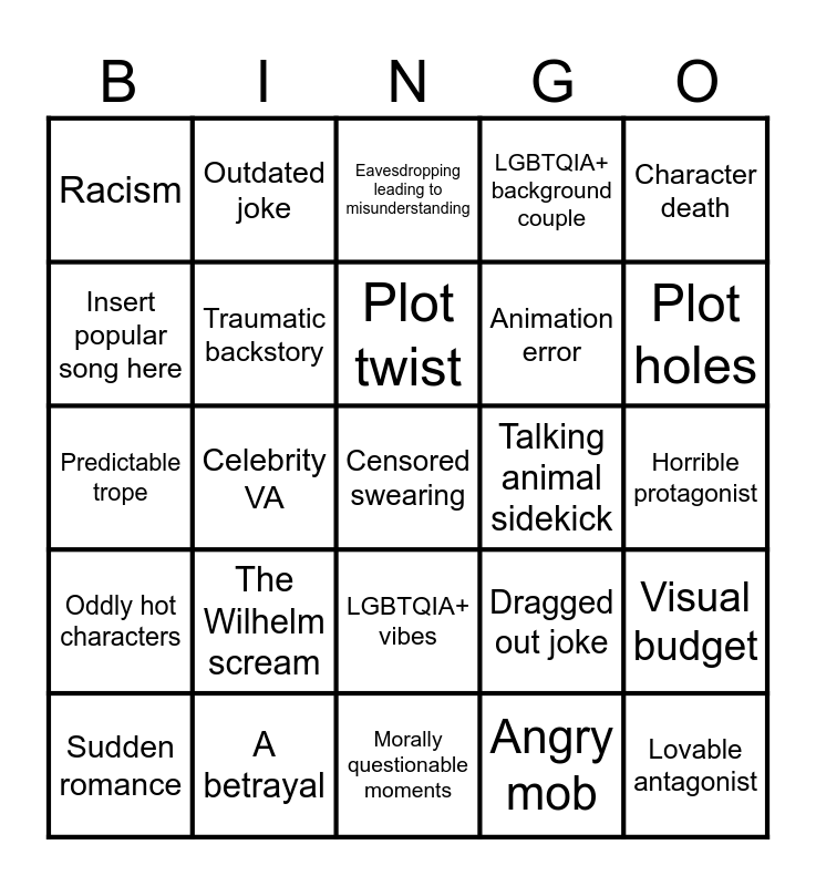 This bingo card has a free space and 24 words: The Wilhelm scream, A betrayal, Plot twist, Sudden romance, Character death, Racism, Insert popular song here, Outdated joke, Talking animal sidekick, LGBTQIA+ vibes, Animation error, Predictable trope, Dragged out joke, Visual budget, Traumatic backstory, Angry mob, Horrible protagonist, Eavesdropping leading to misunderstanding, Plot holes, Celebrity VA, Lovable antagonist, Oddly hot characters, LGBTQIA+ background couple and Morally questionable moments.