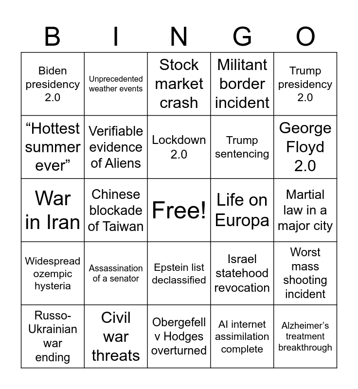 This bingo card has a free space and 24 words: Assassination of a senator, Civil war threats, Lockdown 2.0, Russo-Ukrainian war ending, Trump presidency 2.0, Biden presidency 2.0, “Hottest summer ever”, Unprecedented weather events, Life on Europa, Epstein list declassified, Trump sentencing, War in Iran, Israel statehood revocation, Worst mass shooting incident, Verifiable evidence of Aliens, AI internet assimilation complete, Martial law in a major city, Stock market crash, George Floyd 2.0, Chinese blockade of Taiwan, Alzheimer’s treatment breakthrough, Widespread ozempic hysteria, Militant border incident and Obergefell v Hodges overturned.