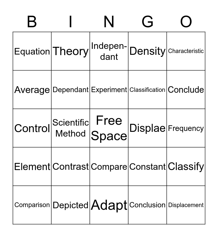This bingo card has a free space and 24 words: Contrast, Depicted, Experiment, Comparison, Characteristic, Equation, Average, Theory, Displae, Compare, Classification, Control, Constant, Classify, Dependant, Conclusion, Frequency, Indepen- dant, Conclude, Scientific Method, Displacement, Element, Density and Adapt.