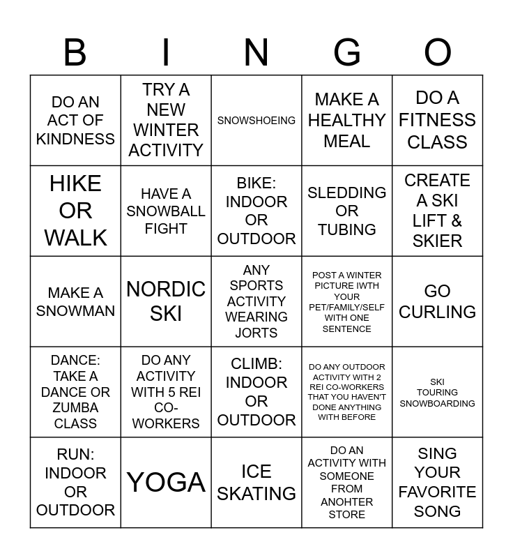 This bingo card has a free space and 24 words: DO ANY ACTIVITY WITH 5 REI CO-WORKERS, YOGA, BIKE: INDOOR OR OUTDOOR, RUN: INDOOR OR OUTDOOR, DO A FITNESS CLASS, DO AN ACT OF KINDNESS, HIKE OR WALK, TRY A NEW WINTER ACTIVITY, POST A WINTER PICTURE IWTH YOUR PET/FAMILY/SELF WITH ONE SENTENCE, CLIMB: INDOOR OR OUTDOOR, SLEDDING OR TUBING, MAKE A SNOWMAN, DO ANY OUTDOOR ACTIVITY WITH 2 REI CO-WORKERS THAT YOU HAVEN'T DONE ANYTHING WITH BEFORE, SKI TOURING SNOWBOARDING, HAVE A SNOWBALL FIGHT, DO AN ACTIVITY WITH SOMEONE FROM ANOHTER STORE, GO CURLING, SNOWSHOEING, CREATE A SKI LIFT & SKIER, NORDIC SKI, SING YOUR FAVORITE SONG, DANCE: TAKE A DANCE OR ZUMBA CLASS, MAKE A HEALTHY MEAL and ICE SKATING.