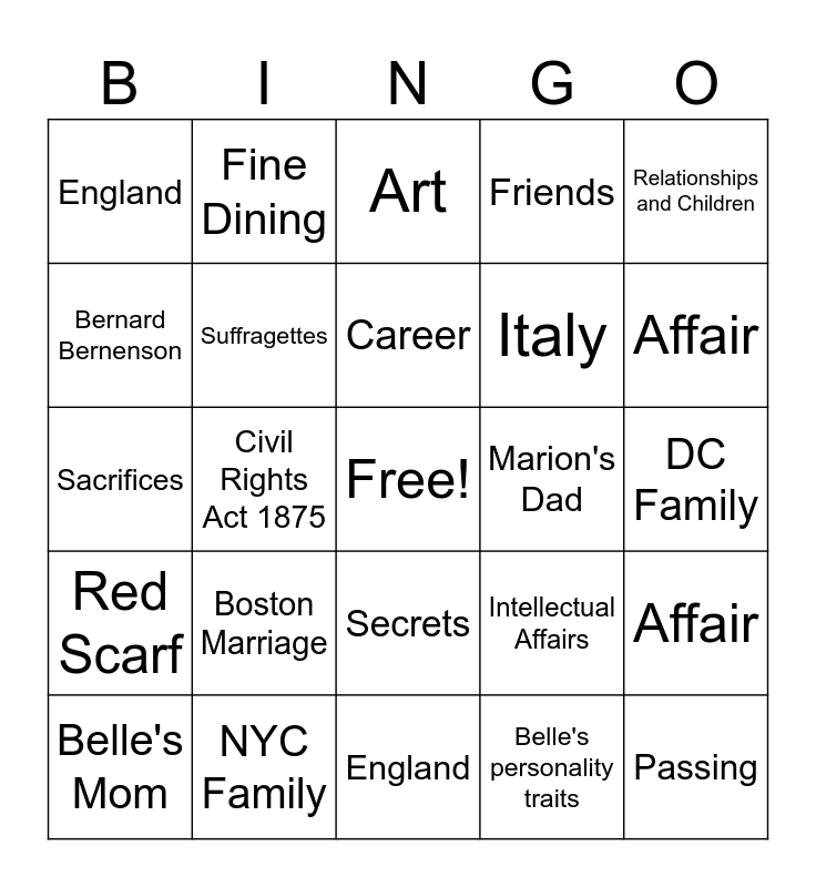 This bingo card has a free space and 29 words: Belle's Mom, Racial Issues Today, Civil Rights Act 1875, Identity, England, Art, Suffragettes, Boston Marriage, Marion's Dad, NYC Family, DC Family, Passing, England, Belle's personality traits, Affair, Princeton, Secrets, Red Scarf, Relationships and Children, Sacrifices, Intellectual Affairs, Heritage, Italy, Bernard Bernenson, Friends, Fine Dining, Affair, Career and Protect Family.