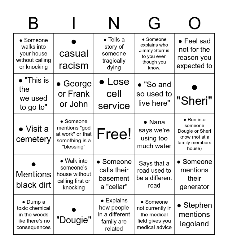 This bingo card has a free space and 27 words: Says that a road used to be a different road, Describes in detail a different route we could've taken to get to the same place, ● "So and so used to live here", ● Explains how people in a different family are related, ● "This is the ____ we used to go to", ● Tells a story of someone tragically dying, ● casual racism, ● Mentions black dirt, ● Nana says we're using too much water, ● Someone mentions their generator, ● Visit a cemetery, ● Someone explains who Jimmy Sturr is to you even though you know., ● Dump a toxic chemical in the woods like there's no consequences, ● "Dougie", ● "Sheri", ● Someone spells their polish or German last name however they want, ● George or Frank or John, ● Lose cell service, ● Walk into someone's house without calling first or knocking, ● Someone walks into your house without calling or knocking, ● Run into someone Dougie or Sheri know (not at a family members house), ● Someone not currently in the medical field gives you medical advice, ● Someone mentions "god at work" or that something is a "blessing", ● Stephen mentions legoland, ● Someone calls their basement a "cellar", ● Feel sad not for the reason you expected to and ● Eat pie.
