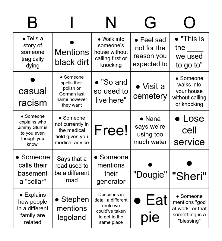 This bingo card has a free space and 25 words: Says that a road used to be a different road, Describes in detail a different route we could've taken to get to the same place, ● "So and so used to live here", ● Explains how people in a different family are related, ● "This is the ____ we used to go to", ● Tells a story of someone tragically dying, ● casual racism, ● Mentions black dirt, ● Nana says we're using too much water, ● Someone mentions their generator, ● Visit a cemetery, ● Someone explains who Jimmy Sturr is to you even though you know., ● "Dougie", ● "Sheri", ● Someone spells their polish or German last name however they want, ● George or Frank or John, ● Lose cell service, ● Walk into someone's house without calling first or knocking, ● Someone walks into your house without calling or knocking, ● Someone not currently in the medical field gives you medical advice, ● Someone mentions "god at work" or that something is a "blessing", ● Stephen mentions legoland, ● Someone calls their basement a "cellar", ● Feel sad not for the reason you expected to and ● Eat pie.