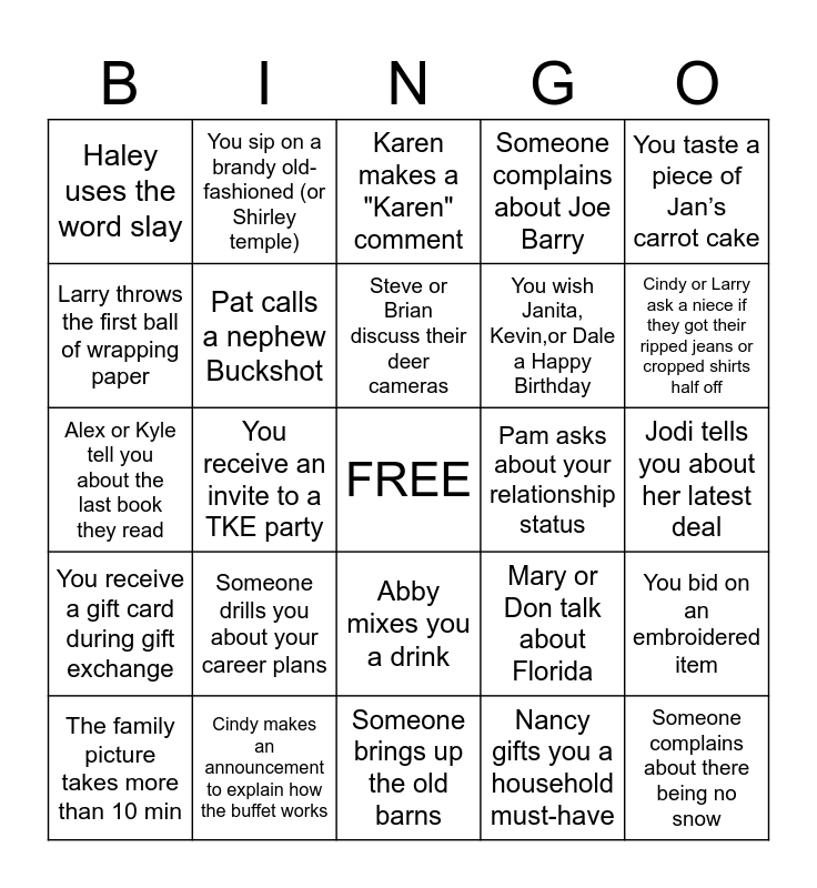 This bingo card has a free space and 24 words: Someone drills you about your career plans, Cindy makes an announcement to explain how the buffet works, Steve or Brian discuss their deer cameras, The family picture takes more than 10 min, You taste a piece of Jan’s carrot cake, Haley uses the word slay, Larry throws the first ball of wrapping paper, You sip on a brandy old-fashioned (or Shirley temple), Pam asks about your relationship status, Abby mixes you a drink, You wish Janita, Kevin,or Dale a Happy Birthday, Alex or Kyle tell you about the last book they read, Mary or Don talk about Florida, You bid on an embroidered item, Pat calls a nephew Buckshot, Nancy gifts you a household must-have, Jodi tells you about her latest deal, Karen makes a "Karen" comment, Cindy or Larry ask a niece if they got their ripped jeans or cropped shirts half off, You receive an invite to a TKE party, Someone complains about there being no snow, You receive a gift card during gift exchange, Someone complains about Joe Barry and Someone brings up the old barns.