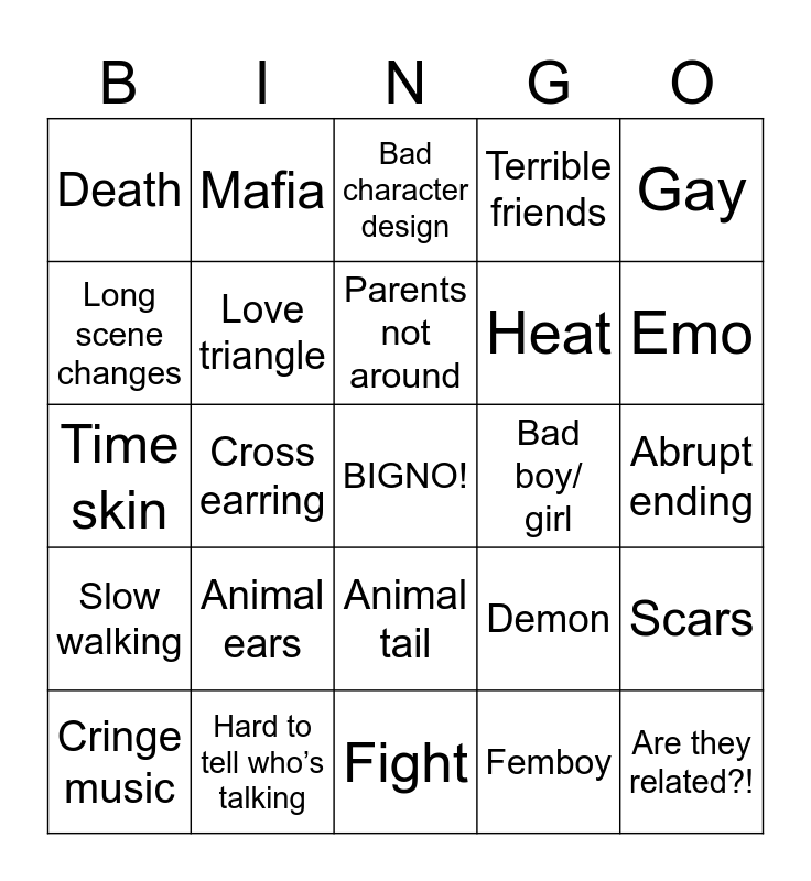 This bingo card has a free space and 24 words: Cringe music, Animal ears, Parents not around, Femboy, Gay, Death, Mafia, Bad character design, Bad boy/ girl, Abrupt ending, Time skin, Love triangle, Demon, Scars, Long scene changes, Hard to tell who’s talking, Fight, Terrible friends, Emo, Slow walking, Cross earring, Animal tail, Heat and Are they related?!.