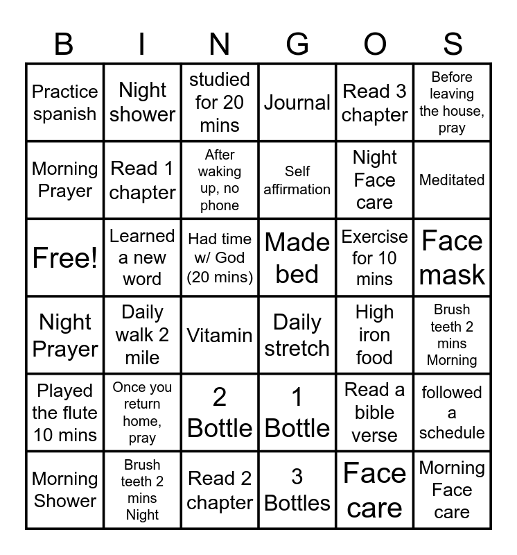 This bingo card has 36 words: 1 Bottle, 2 Bottle, 3 Bottles, Morning Prayer, Night Prayer, Made bed, Read 1 chapter, Read 2 chapter, Read 3 chapter, Read a bible verse, Meditated, Journal, followed a schedule, Learned a new word, Self affirmation, Practice spanish, Played the flute 10 mins, Exercise for 10 mins, Free!, studied for 20 mins, Had time w/ God (20 mins), Daily walk 2 mile, Daily stretch, Vitamin, High iron food, Night shower, Night Face care, Brush teeth 2 mins Night, After waking up, no phone, Before leaving the house, pray, Morning Face care, Morning Shower, Brush teeth 2 mins Morning, Face mask, Once you return home, pray and Face care.