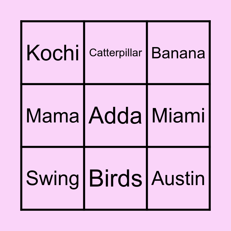 This bingo card has a free space and 32 words: Berries, Lomi, Sofie, Ahkoo, Lali, Swing, Austin, Binky, Catterpillar, Onesie, Birds, Banana, Bobo, Tata, Milk, Lala, Sun, Sweeties, Bruce, Buhbye, Slide, Leaves, Flowers, Moon, Dada, Mama, Chicago, Miami, Kochi, Wow, Avocado and Meow.