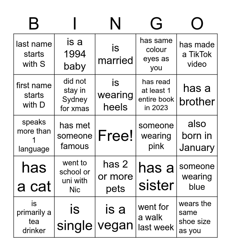This bingo card has a free space and 28 words: someone wearing blue, not big on spicy food, has read at least 1 entire book in 2023, went for a walk last week, first name starts with D, is married, is a 1994 baby, has a cat, someone wearing pink, is primarily a tea drinker, speaks more than 1 language, has same colour eyes as you, is single, is a vegan, has a brother, is the youngest person here, went to school or uni with Nic, did not stay in Sydney for xmas, is wearing heels, has 2 or more pets, last name starts with S, has nude nails, wears the same shoe size as you, has met someone famous, also born in January, has a sister, has made a TikTok video and has been to Europe.