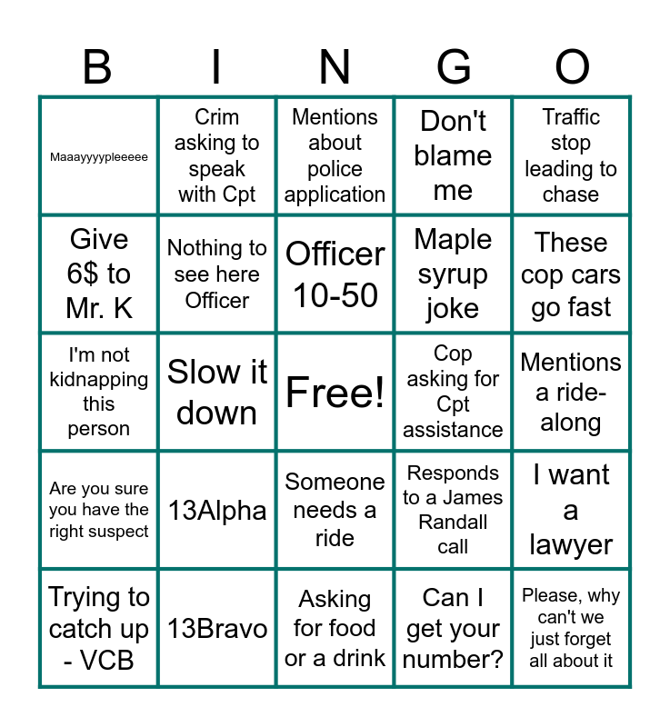 This bingo card has a free space and 24 words: 13Alpha, 13Bravo, Officer 10-50, Trying to catch up - VCB, Traffic stop leading to chase, Maaayyyypleeeee, Give 6$ to Mr. K, Crim asking to speak with Cpt, Cop asking for Cpt assistance, Someone needs a ride, Maple syrup joke, I'm not kidnapping this person, Responds to a James Randall call, I want a lawyer, Nothing to see here Officer, Can I get your number?, Mentions a ride-along, Mentions about police application, These cop cars go fast, Slow it down, Please, why can't we just forget all about it, Are you sure you have the right suspect, Don't blame me and Asking for food or a drink.