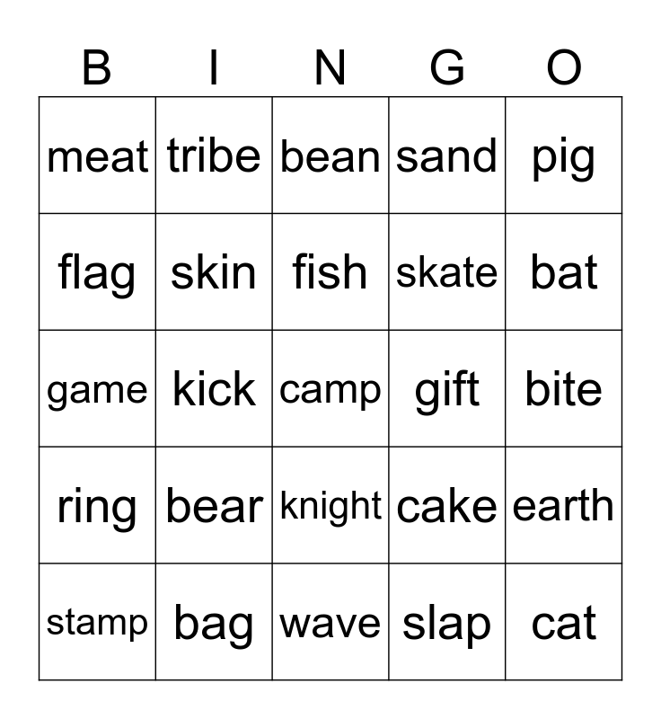 This bingo card has 40 words: ace, game, cave, skin, bag, knight, fish, mint, pig, ring, kick, sand, camp, bite, gift, bear, gate, meat, steak, bean, earth, slap, skate, flag, snack, map, band, flame, cat, hill, bank, stamp, trap, cake, bat, wave, lake, hat, tribe and heat.