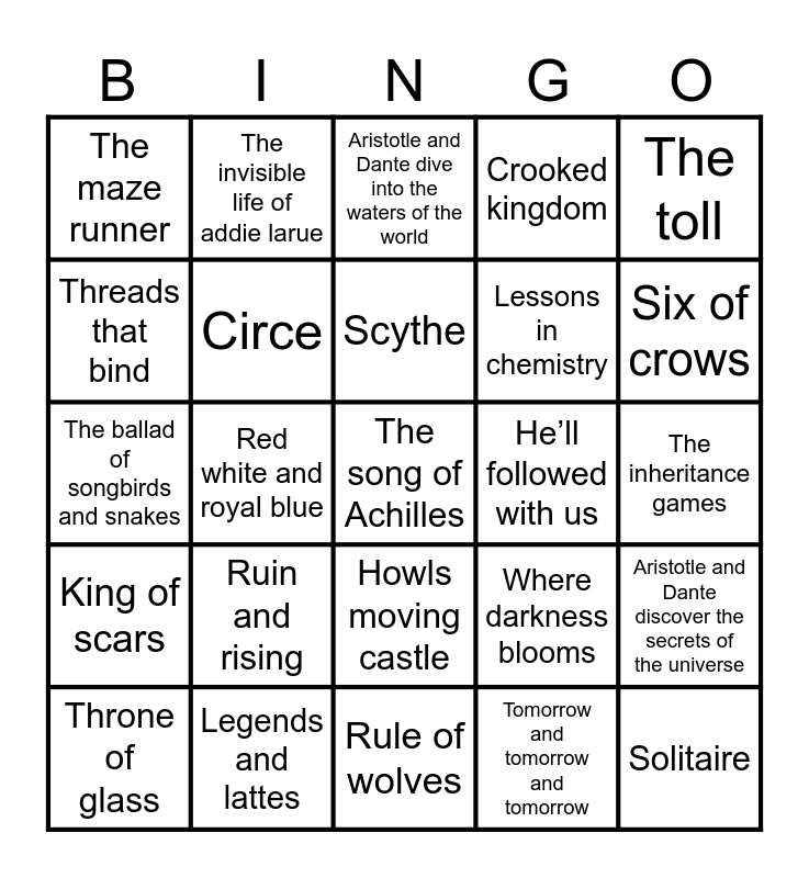 This bingo card has a free space and 24 words: Ruin and rising, Legends and lattes, Scythe, Throne of glass, The toll, The maze runner, Threads that bind, The invisible life of addie larue, He’ll followed with us, Howls moving castle, Lessons in chemistry, The ballad of songbirds and snakes, Where darkness blooms, Aristotle and Dante discover the secrets of the universe, Circe, Tomorrow and tomorrow and tomorrow, The inheritance games, Aristotle and Dante dive into the waters of the world, Six of crows, Red white and royal blue, Solitaire, King of scars, Crooked kingdom and Rule of wolves.