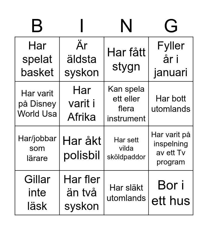 This bingo card has 16 words: Har fler än två syskon, Har varit på inspelning av ett Tv program, Har fått stygn, Har spelat basket, Har/jobbar som lärare, Är äldsta syskon, Har sett vilda sköldpaddor, Har släkt utomlands, Har varit på Disney World Usa, Har varit i Afrika, Gillar inte läsk, Fyller år i januari, Har åkt polisbil, Har bott utomlands, Kan spela ett eller flera instrument and Bor i ett hus.