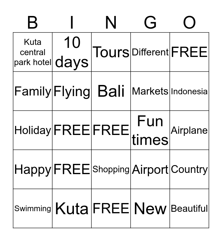 This bingo card has a free space and 24 words: FREE, Kuta, Bali, Swimming, FREE, Kuta central park hotel, Family, 10 days, Fun times, Shopping, Markets, Holiday, Airport, Country, Flying, New, Airplane, Tours, Indonesia, FREE, Beautiful, Happy, Different and FREE.