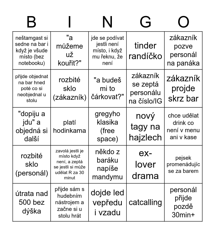 This bingo card has a free space and 34 words: přijde, rozhlédne se, odejde, catcalling, Jde na jinej záchod, někdo se poblije, rozbité sklo (personál), rozbité sklo (zákazník), zákazník pozve personál na panáka, útrata nad 500 bez dýška, "a můžeme už kouřit?", "můžu pustit jeden song?", "a budeš mi to čárkovat?", jde se podívat jestli není místo, i když mu řeknu, že není, židličky, odejde bez placení, nový tagy na hajzlech, zákazník projde skrz bar, přijde sám s hudebním nástrojem a začne si u stolu hrát, "dopiju a jdu" a objedná si další, zavolá jestli je místo když není, a zeptá se jestli si může udělat R za 30 minut, ex-lover drama, někdo z baráku napíše mandymu, policie, neštamgast si sedne na bar i když je všude místo (bez notebooku), chce udělat drink co není v menu ani v kase, dojde led vepředu i vzadu, personál přijde pozdě 30min+, tinder randíčko, veřejně známá osoba, zákazník se zeptá personálu na číslo/IG, přijde objednat na bar hned poté co si neobjednal u stolu, platba zamítnuta z finančních důvodů, platí hodinkama, pejsek promenádujíc se za barem and nekonsensuální manipulace se stoly.