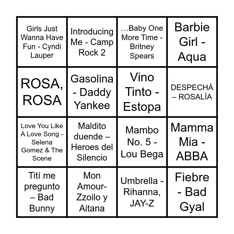 This bingo card has 106 words: LUNA TUCUMANA, GARGANTA CON ARENA, ROSA, ROSA, A DON ATA, MI BUENOS AIRES QUERIDO, A MI MANERA, TE QUIERO TANTO, PEGA LA VUELTA, ZAMBA DE MI ESPERANZA, AMOR SALVAJE, QUE NADIE SEPA MI SUFRIR, LA POLLERA AMARILLA, BOMBÓN ASESINO, ZAMBA PARA OLVIDARTE, ETERNO AMOR, VIVIR ASÍ ES MORIR DE AMOR, …Baby One More Time - Britney Spears, A Dios Le Pido - Juanes, A quién le importa - Fangoria, All Star - Smash Mouth, Desátame – Monica Naranjo, Aserejé - Las Ketchup, 7 rings – Ariana Grande, Baby - Justin Bieber, Ludacris, Bad Romance - Lady Gaga, Bailando por Ahí - Juan Magan, Maldito duende – Heroes del Silencio, Barbie Girl - Aqua, Una lluna a l’aigua - Txarango, Bizcochito -ROSALIA, Prologue – Harry Potter Soundtrack, Bzrp Music Session Vol. 51 - Bizarrap, Villano Antillano, Chulo - Bad Gyal, Como Camarón - Estopa, Cry Baby – Janis Joplin, Malamente -ROSALIA, Dancing Queen - ABBA, Yo tengo un novio – Lola Indigo y La Zowi, DESPECHÁ – ROSALÍA, Detectiu Conan, Don't You Worry Child - Swedish House Mafia, El Taxi - Osmani Garcia, Pitbull, Sensato, Espies de Veritat, Fiebre - Bad Gyal, Flying Free - Pont Aeri, Gasolina - Daddy Yankee, Gimme! Gimme! Gimme! (A Man After Midnight) - ABBA, Girls Just Wanna Have Fun - Cyndi Lauper, Give Me Everything - Pitbull, Ne-Yo, AFROJACK, Nayer, Tití me pregunto – Bad Bunny, Hattori el Ninja, Hay Que Venir al Sur - Raffaella Carrà, Tri Poloski - Davay, Hips Don't Lie - Shakira, Wyclef Jean, Hotel Room Service - Pitbull, I Follow Rivers - Lykke Li, The Magician, I Gotta Feeling - Black Eyed Peas, I Want It That Way - Backstreet Boys, ANTAGONISTA – Belén Aguilera, Introducing Me - Camp Rock 2, Summertime Sadness – Lana del Rey, La Camisa Negra - Juanes, Coti x coti -The Tyets, LA PLATJA - Stay Homas, The Tyets, Un violinista en tu tejado - Melendi, Wannabe -Spice Girls, Lean On - Major Lazer, MØ, DJ Sanke, Love Story - Taylor Swift, Love You Like A Love Song - Selena Gomez & The Scene, Mambo No. 5 - Lou Bega, Mamma Mia - ABBA, Mari Carmen - La Pegatina, Moth To A Flame - Swedish House Mafia, The Weeknd, MUSSEGU - Figa Flawas, Ni Una Sola Palabra - Paulina Rubio, No_se_ve.mp3 - Emilia, LUDMILLA, ZECCA, Nochentera - Vicco, On The Floor - Jennifer Lopez, Pitbull, Ordinary Girl - Kate Alexa (h2o), Party In The USA - Miley Cyrus, Por la Raja de Tu Falda - Estopa, Purpurina - Alberto Gambino, Que la Detengan - David Civera, La cosa mas bella -Eros Ramazzotti, Será un día fenomenal - Phineas y Ferb, Shin Chan, Mon Amour- Zzoilo y Aitana, El fin del mundo-LA LA LOVE YOU, Start Of Something New - High School Musical, Single Ladies - Beyonce, Ave María – David Bisbal, The Best of Both Worlds - Hannah Montana, The Climb - Hannah Montana/Miley Cyrus, Titanium - David Guetta, Sia, Todos los días sale el sol - Bongo Botrako, Tenia Tanto que darte – Nena Daconte, Tik Tok - KESHA, Tots Som Súpers - Super3, Toxic - Britney Spears, Umbrella - Rihanna, JAY-Z, Vino Tinto - Estopa, We're All In This Together - High School Musical, YMCA - Village People, Yo Quiero Bailar - Sonia y Selena, Zoey 101 and Zorra - Bad Gyal.