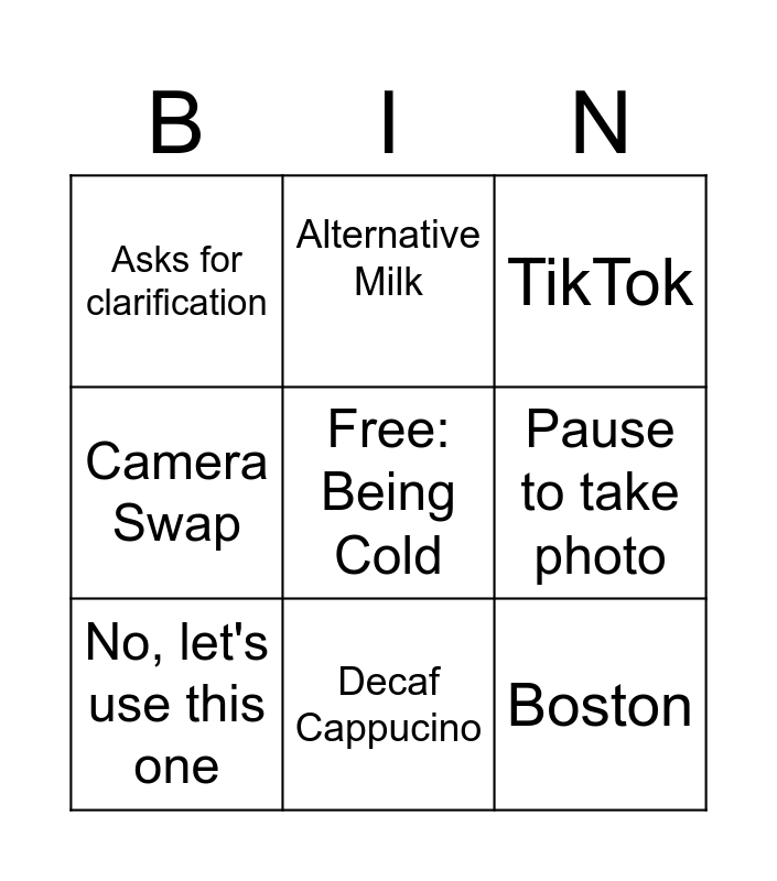 This bingo card has a free space and 11 words: Being Cold, Decaf Cappucino, Boston, No, let's use this one, Alternative Milk, TikTok, Pause to take photo, Scandinavian Minimalism, Camera Swap, Asks for clarification and Silent migraine.