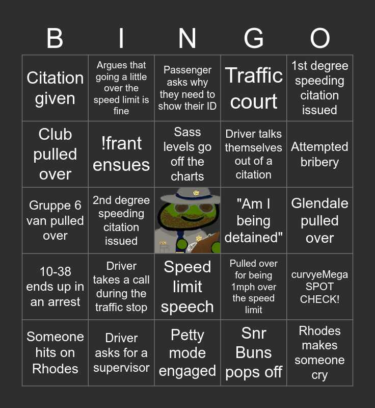 This bingo card has a free space and 56 words: "This vehicle doesn't even go that fast!", Someone hits on Rhodes, Warning given, Citation given, Petty mode engaged, Driver flees, !frant ensues, Driver talks themselves into a citation, Driver talks themselves out of a citation, Rhodes finds a new hidey spot, Traffic court, Repeat offender, Locals go loco, Driver hit with The Book™, Someone gets angy, "Did you even clock me?", 1st degree speeding citation issued, 2nd degree speeding citation issued, 3rd degree speeding citation issued, Rhodes makes someone cry, "Am I being detained", Rhodes ditches his stop for tastier prey, Pulled over for being 1mph over the speed limit, Passenger asks why they need to show their ID, Someone gets incapacitated, Sass levels go off the charts, Driver speeding due to "medical emergency", Driver speeding because they are "running out of gas", Attempted bribery, Opens door instead of window, curvyeMega SLOW DOWN!, "I was speeding because my brakes weren't working", Tow truck pulled over, Grime TRUCK pulled over, Glendale pulled over, Club pulled over, Gruppe 6 van pulled over, Former police officer pulled over, 10-38 ends up in an arrest, Argues that going a little over the speed limit is fine, Speed limit speech, "Why don't you pull over those speeding passing cars?", Complaint made to a superior about Rhodes, Radar accuracy is questioned, Rhodes' ability to estimate how fast someone is going without a radar is questioned., Driver takes a call during the traffic stop, Driver asks for a supervisor, "Oh fuck, it's Rhodes", Passenger digs the driver into a hole, Expired license, Snr Buns pops off, "But I had my speed limiter on!", Rhodes responds to 77/78s call, Rhodes ignores 77/78s call, curvyeMega SPOT CHECK! and Community policing.