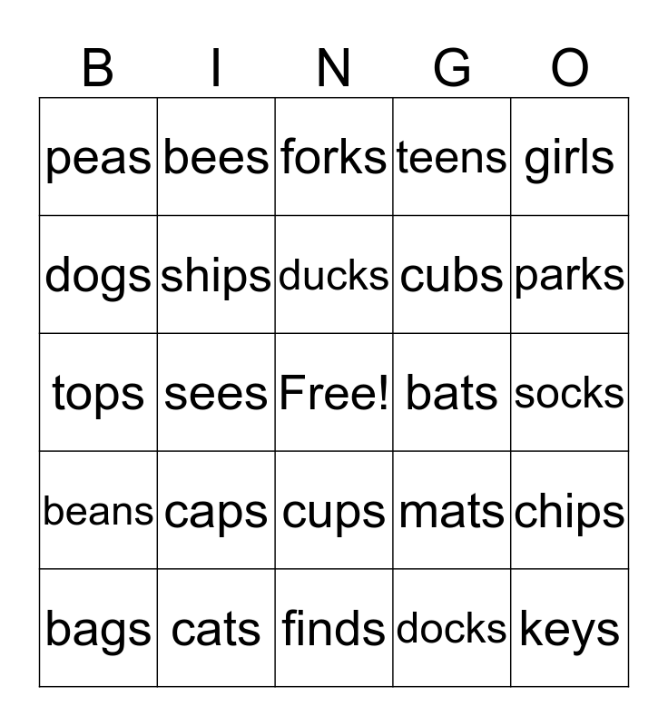 This bingo card has a free space and 24 words: caps, cats, ducks, bags, girls, peas, dogs, bees, bats, cups, cubs, tops, mats, chips, ships, docks, socks, forks, parks, sees, keys, beans, teens and finds.