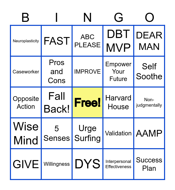 This bingo card has a free space and 34 words: Mindfulness, Interpersonal Effectiveness, Distress Tolerance, Emotional Regulation, Wise Mind, Pros and Cons, DEAR MAN, GIVE, FAST, ACCEPTS, IMPROVE, ABC PLEASE, Radical Acceptance, Growth Mindset, Harvard House, Self Soothe, Willingness, Opposite Action, 5 Senses, Validation, Urge Surfing, Thinking Errors, Neuroplasticity, Non-judgmentally, DYS, Success Plan, DBT MVP, Positive Youth Development, Empower Your Future, Caseworker, Career Navigation, Fall Back!, AAMP and YMCA.