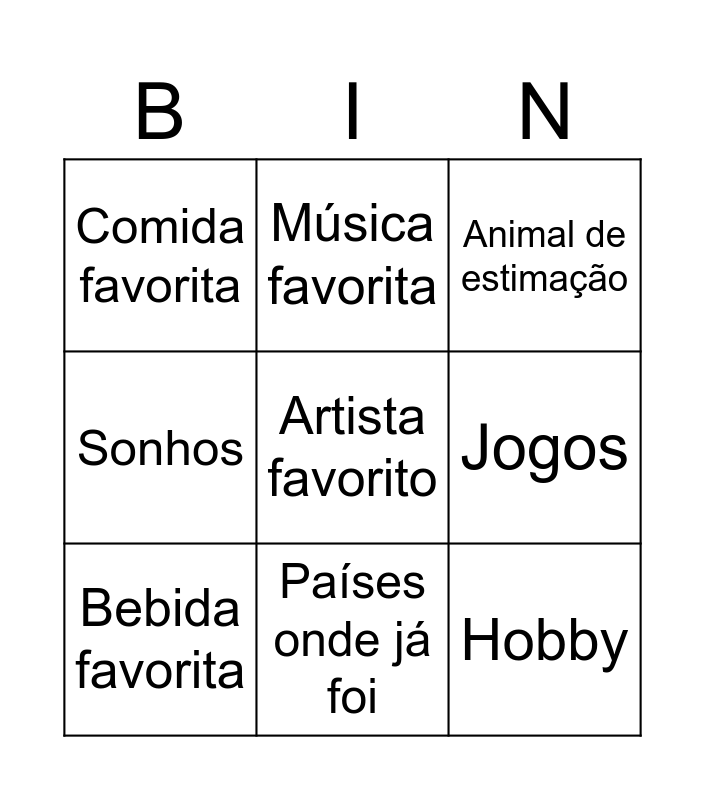This bingo card has a free space and 16 words: Instrumento musical, Fala mais que 2 idiomas, Animal de estimação, Comida favorita, Filme favorito, Música favorita, Desporto, Física, Hobby, Jogos, Ídolo, Sonhos, Redes Sociais, Países onde já foi, Bebida favorita and Cor favorita.