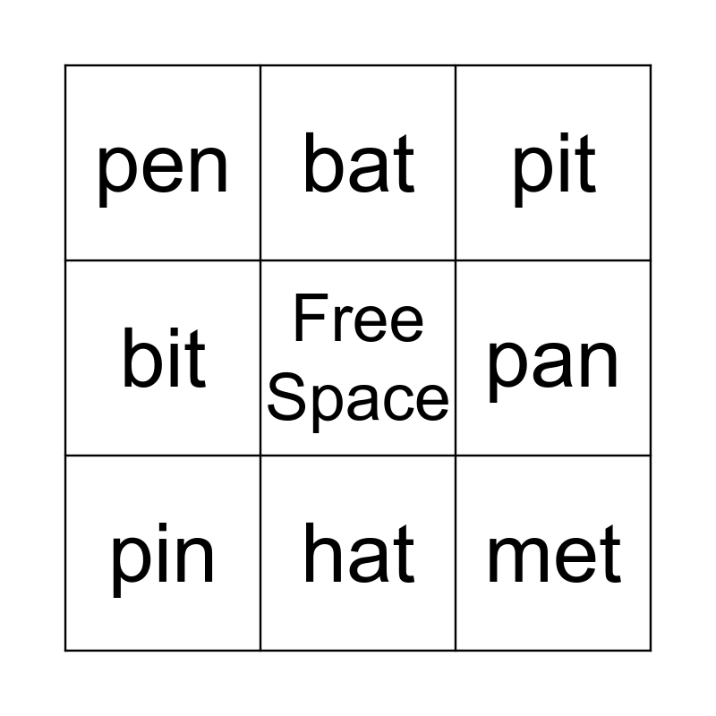 This bingo card has a free space and 8 words: pan, pit, bat, pin, pen, met, bit and hat.