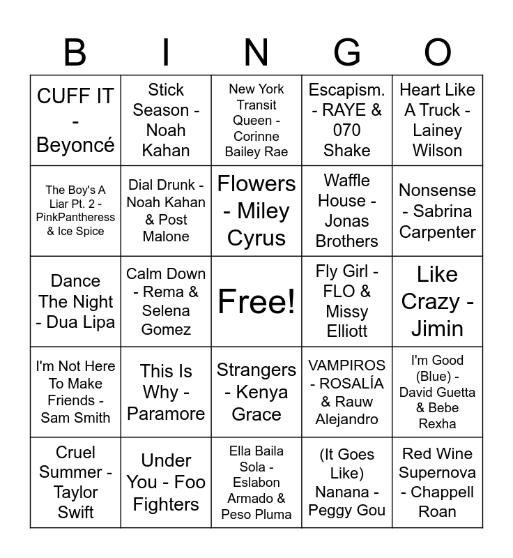This bingo card has a free space and 74 words: I’m Just Ken - Ryan Gosling, drive ME crazy! - Lil Yachty, New York Transit Queen - Corinne Bailey Rae, Where do we go now? - Gracie Abrams, Lil Boo Thang - Paul Russell, Area Codes - Kaliii, California Sober - Billy Strings & Willie Nelson, Lovin On Me - Jack Harlow, Cruel Summer - Taylor Swift, Paint The Town Red - Doja Cat, I Remember Everything - Zach Bryan & Kacey Musgraves, Anti-Hero - Taylor Swift, Flowers - Miley Cyrus, The Boy's A Liar Pt. 2 - PinkPantheress & Ice Spice, get him back! - Olivia Rodrigo, Calm Down - Rema & Selena Gomez, MONACO - Bad Bunny, Nonsense - Sabrina Carpenter, Need A Favor - Jelly Roll, Dance The Night - Dua Lipa, Dial Drunk - Noah Kahan & Post Malone, Stick Season - Noah Kahan, Escapism. - RAYE & 070 Shake, Players - Coi Leray, Red Wine Supernova - Chappell Roan, un x100to - Grupo Frontera & Bad Bunny, Water - Tyla, AMERICA HAS A PROBLEM - Beyoncé, Creepin' - Metro Boomin, greedy - Tate McRae, Heart Like A Truck - Lainey Wilson, Last Night - Morgan Wallen, Padam Padam - Kylie Minogue, White Horse - Chris Stapleton, From The Start - Laufey, (It Goes Like) Nanana - Peggy Gou, All My Life - Lil Durk,J. Cole, Fast Car - Luke Combs, Cupid - FIFTY FIFTY, Shakira: Bzrp Music Sessions, Vol. 53 - Bizarrap & Shakira, Ella Baila Sola - Eslabon Armado & Peso Pluma, Under You - Foo Fighters, Seven - Jung Kook,Latto, 2 die 4 - Addison Rae & Charli XCX, Love From The Other Side - Fall Out Boy, CUFF IT - Beyoncé, Shy Boy - Carly Rae Jepsen, This Is Why - Paramore, UNAVAILABLE - Davido, Kill Bill - SZA & Doja Cat, As It Was - Harry Styles, Oh U Went - Young Thug & Drake, Like Crazy - Jimin, Slime You Out - Drake & SZA, First Person Shooter - Drake & J. Cole, Karma - Taylor Swift & Ice Spice, Strangers - Kenya Grace, Eat Your Young - Hozier, Used To Be Young - Miley Cyrus, I'm Good (Blue) - David Guetta & Bebe Rexha, Waffle House - Jonas Brothers, Better Place - *NSYNC & Justin Timberlake, I'm Not Here To Make Friends - Sam Smith, Snooze - SZA, Fly Girl - FLO & Missy Elliott, What It Is (Block Boy) - Doechii & Kodak Black, On My Mama - Victoria Monét, Not Strong Enough - boygenius, VAMPIROS - ROSALÍA & Rauw Alejandro, RUNAWAY - OneRepublic, Chemical - Post Malone, Lose Control - Teddy Swims, Single Soon - Selena Gomez and bad idea right? - Olivia Rodrigo.