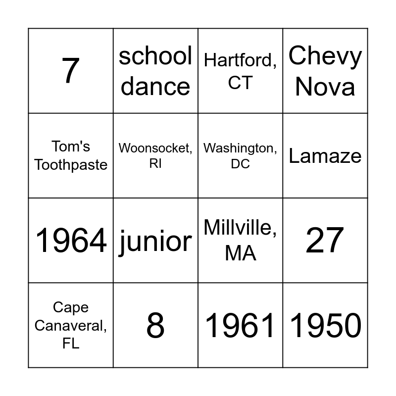 This bingo card has 20 words: 27, 21, Hartford, CT, Lamaze, Cape Canaveral, FL, Tom's Toothpaste, 8, 7, 1964, school dance, junior, Millville, MA, Woonsocket, RI, 1950, Washington, DC, ER, Lamaze, Chevy Nova, 1961 and 35.