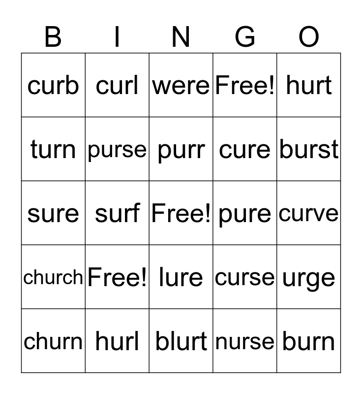 This bingo card has a free space and 24 words: Free!, hurl, purr, churn, hurt, curb, turn, curl, pure, lure, cure, sure, curse, urge, purse, nurse, curve, were, burst, surf, burn, church, Free! and blurt.