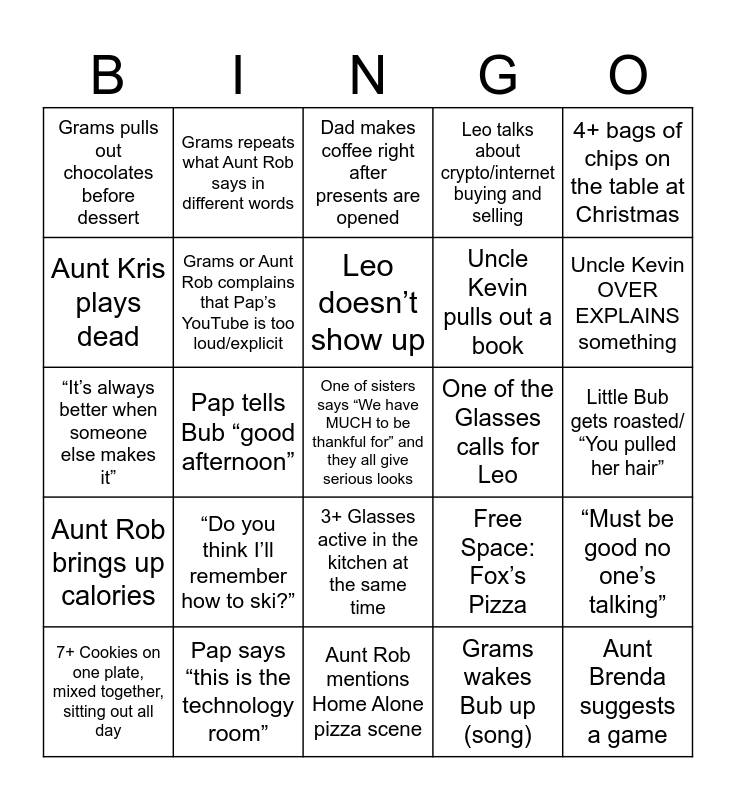 This bingo card has 25 words: “Do you think I’ll remember how to ski?”, Aunt Rob mentions Home Alone pizza scene, Leo doesn’t show up, 7+ Cookies on one plate, mixed together, sitting out all day, 4+ bags of chips on the table at Christmas, Grams pulls out chocolates before dessert, Aunt Kris plays dead, Grams repeats what Aunt Rob says in different words, One of the Glasses calls for Leo, 3+ Glasses active in the kitchen at the same time, Uncle Kevin pulls out a book, “It’s always better when someone else makes it”, Free Space: Fox’s Pizza, “Must be good no one’s talking”, Grams or Aunt Rob complains that Pap’s YouTube is too loud/explicit, Aunt Brenda suggests a game, Little Bub gets roasted/ “You pulled her hair”, Dad makes coffee right after presents are opened, Uncle Kevin OVER EXPLAINS something, Pap tells Bub “good afternoon”, One of sisters says “We have MUCH to be thankful for” and they all give serious looks, Pap says “this is the technology room”, Aunt Rob brings up calories, Leo talks about crypto/internet buying and selling and Grams wakes Bub up (song).