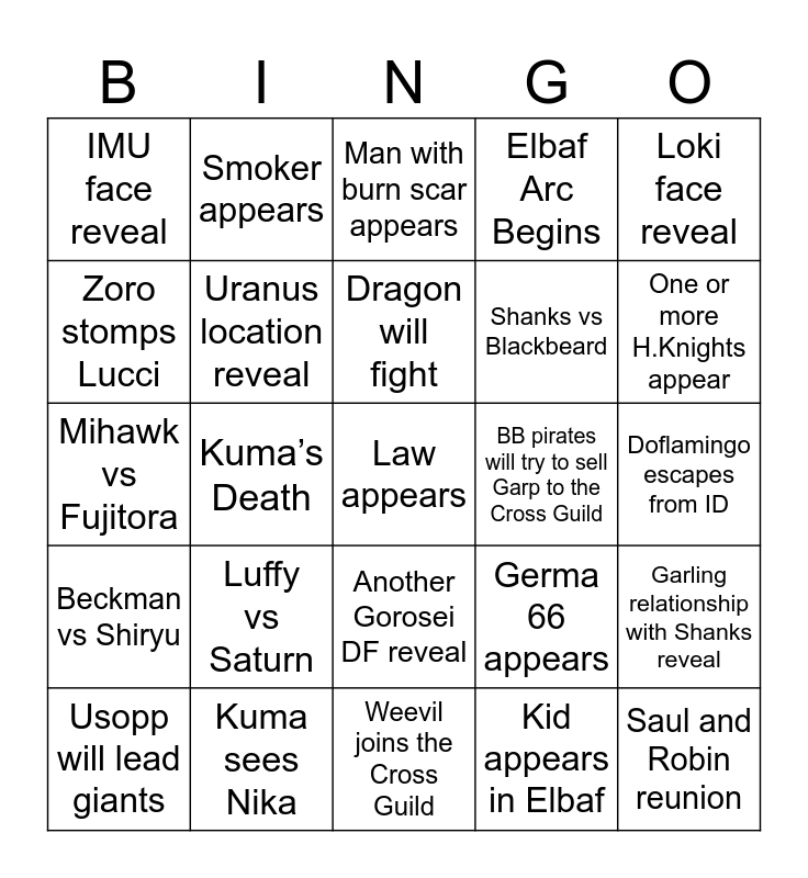 This bingo card has a free space and 24 words: Luffy vs Saturn, Kuma sees Nika, Dragon will fight, Usopp will lead giants, Loki face reveal, IMU face reveal, Zoro stomps Lucci, Smoker appears, BB pirates will try to sell Garp to the Cross Guild, Another Gorosei DF reveal, Shanks vs Blackbeard, Mihawk vs Fujitora, Germa 66 appears, Garling relationship with Shanks reveal, Uranus location reveal, Kid appears in Elbaf, Doflamingo escapes from ID, Man with burn scar appears, One or more H.Knights appear, Kuma’s Death, Saul and Robin reunion, Beckman vs Shiryu, Elbaf Arc Begins and Weevil joins the Cross Guild.